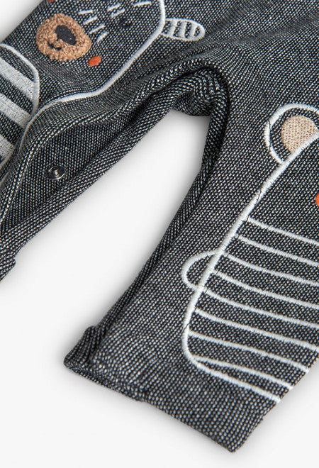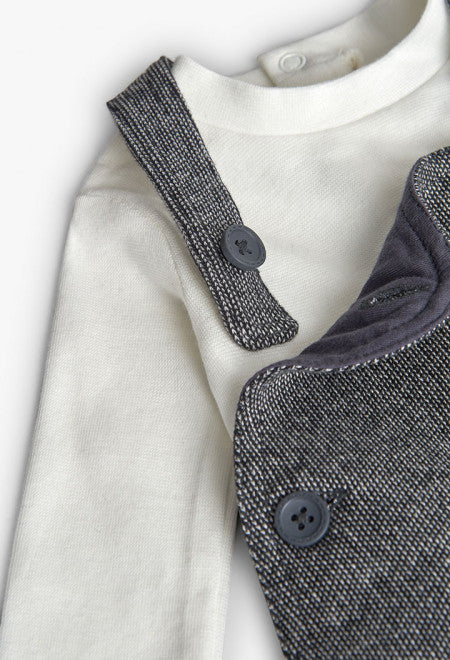 Baby knit set in grey with charming animal designs, making it a fun and modern choice for your little one. Crafted from soft fabric ensuring comfort and freedom of movement. Ideal for any season, it includes a jumper and dungarees, perfect for keeping your child warm. Buttons on the straps and sides of the dungarees make changing clothes easier, simplifying the daily dressing routine. It's an ideal choice to pair with trainers or ankle boots, effortlessly fitting multiple occasions.