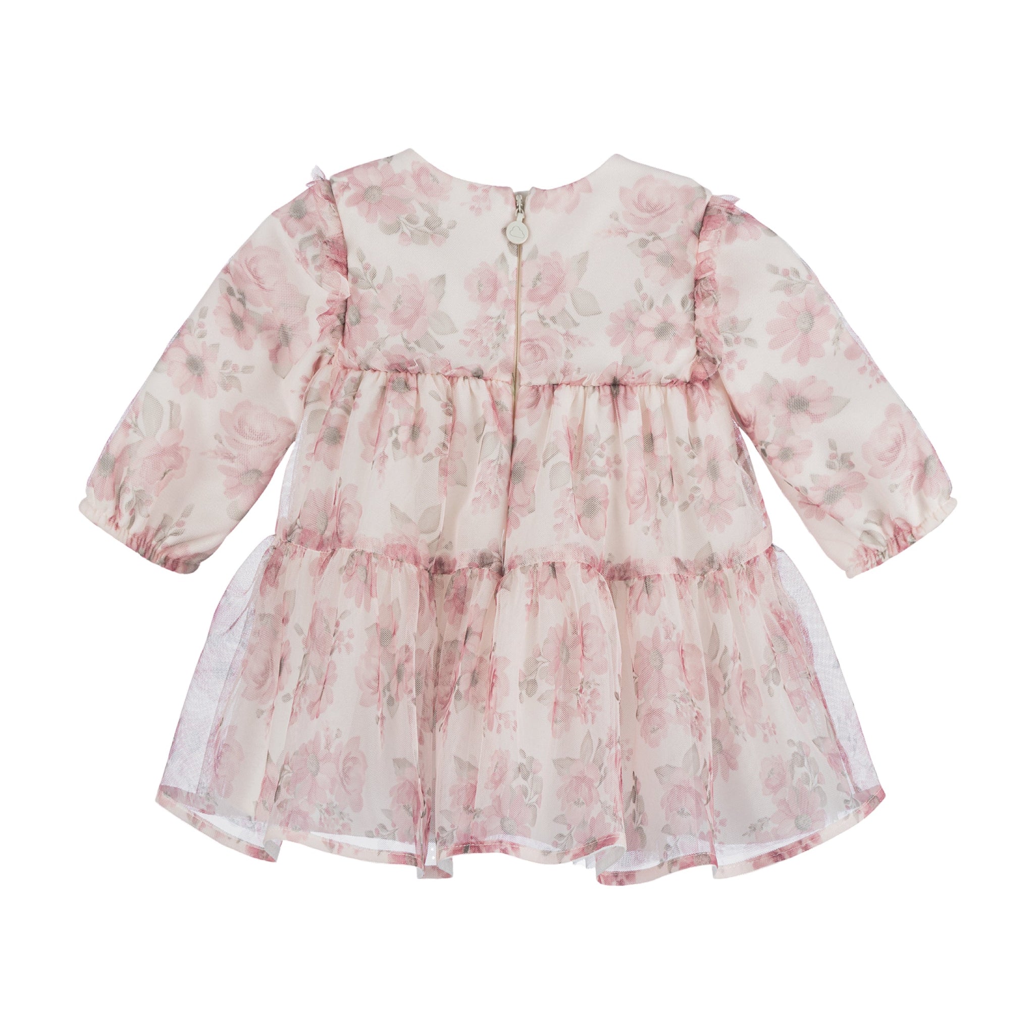 PInk floral tulle smocked dress for baby girls from Mayoral. Featuring a pink floral design, round neck, long sleeves and tulle skirt.