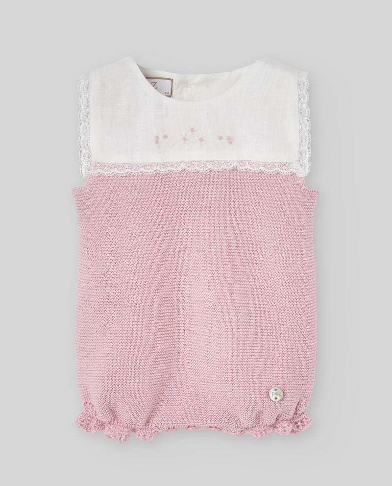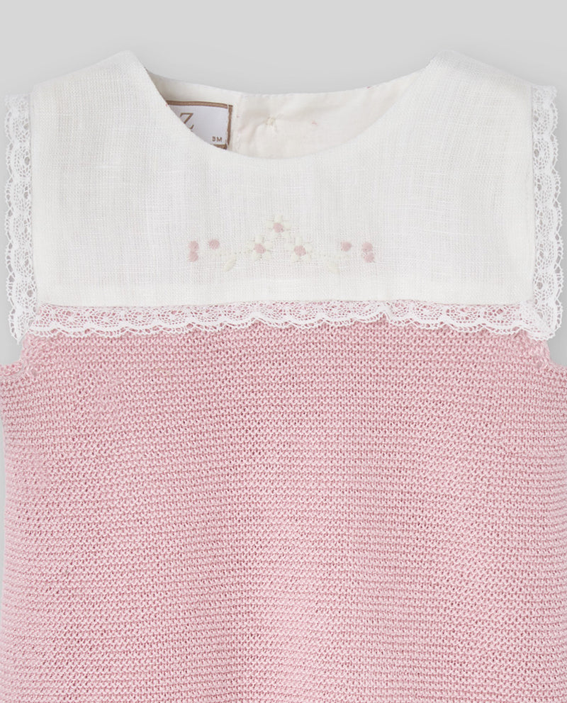 Girl's knitted romper with a pink knit body and linen yoke adorned with floral embroidery and lace trim. A delicate design from the "Alegra" collection.