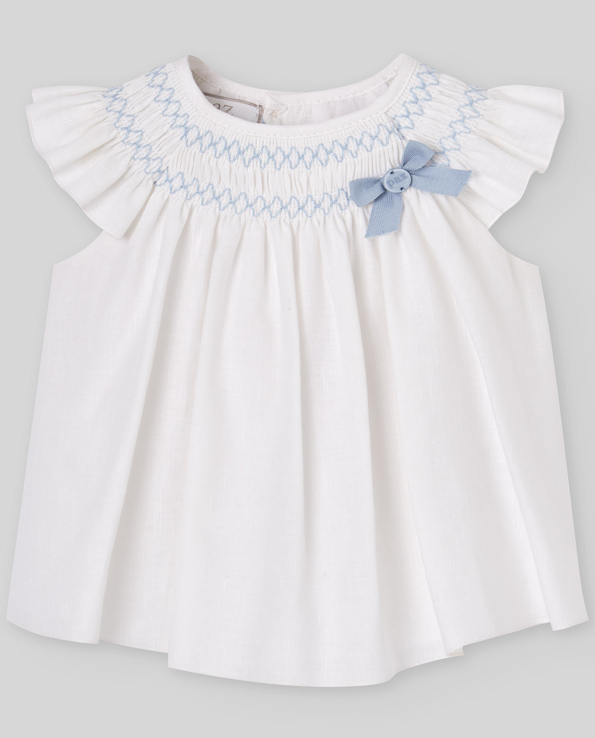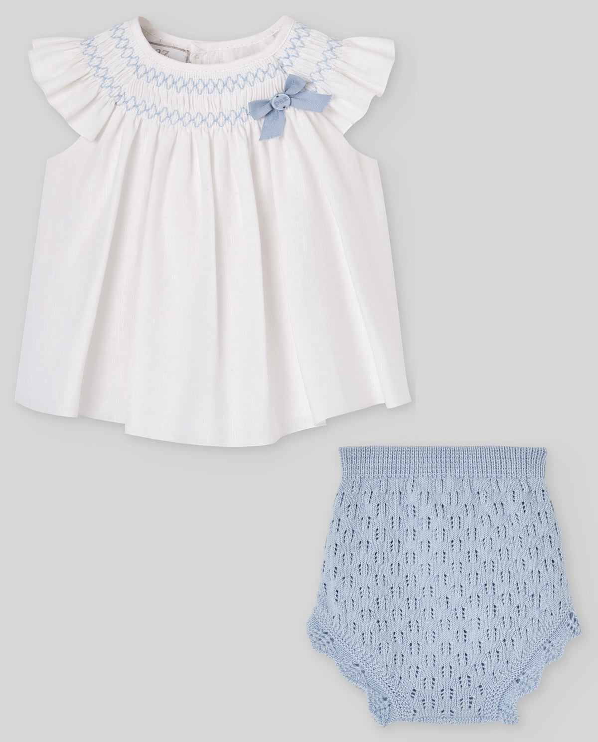 Set for girl from the "Espuma" collection, composed of a short lightweight dress with delicate embroidery and matching bloomers. Perfect for ceremonies or summer events, combining elegance and comfort.