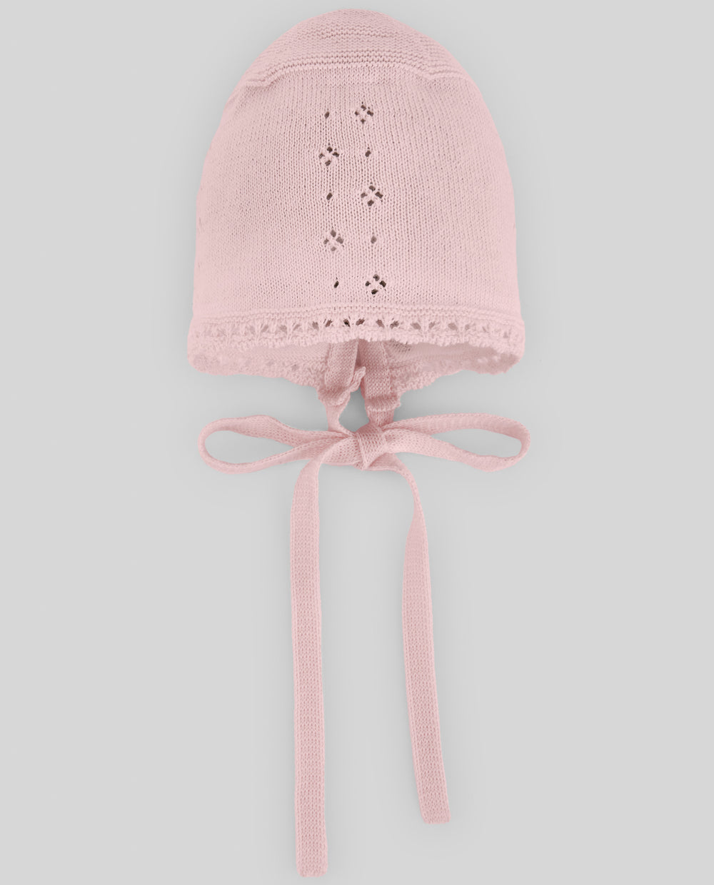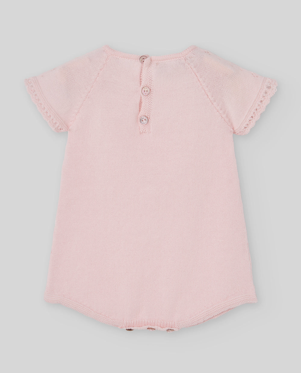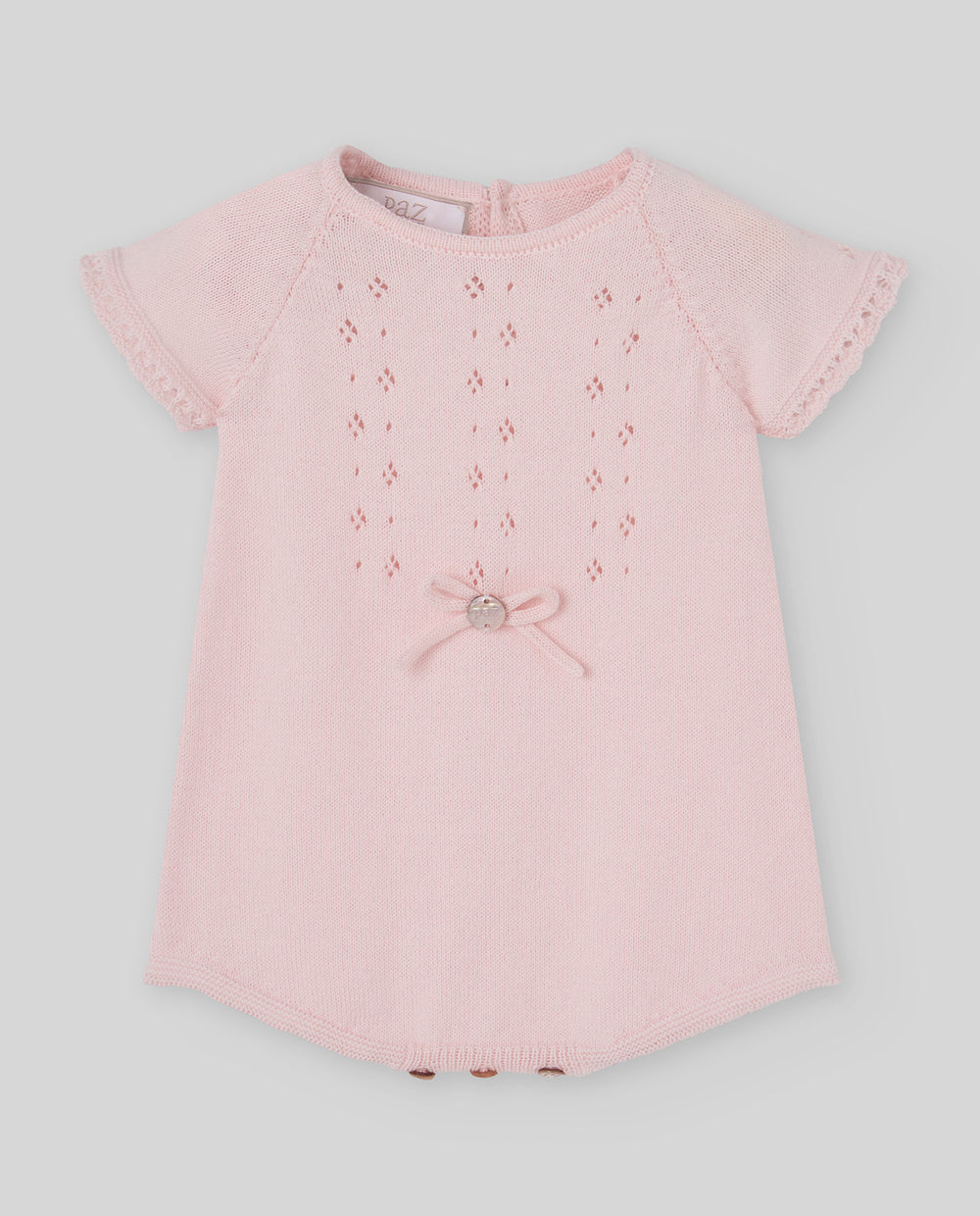 Short openwork knitted romper for baby girl with lace and bow detail. A special piece that combines delicacy, softness, and artisanal elegance.
