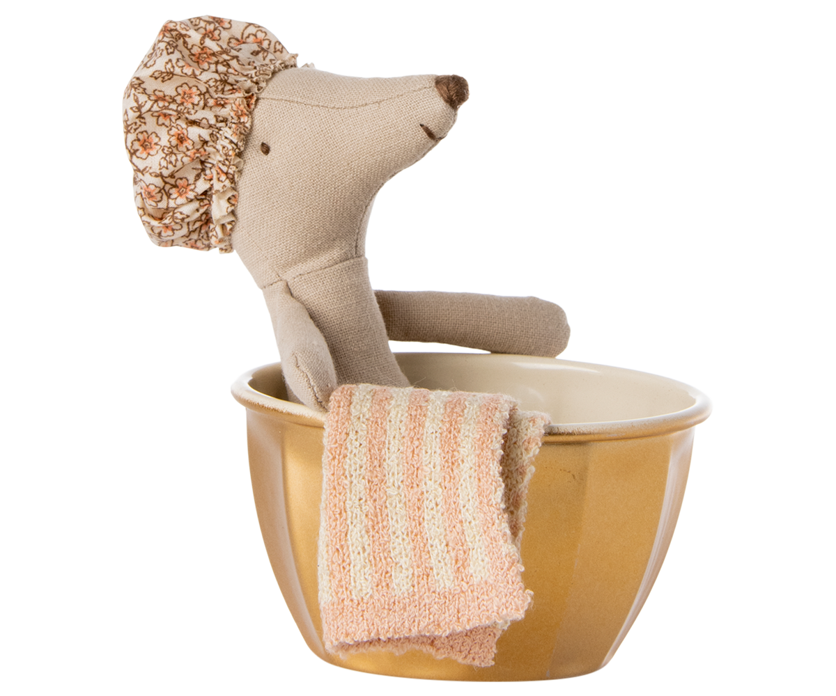 Like everyone else, this mouse loves to spend hours in the warm water in her lovely bathtub. This playset contains a golden metal bathtub, a big sister mouse, a shower cap, and a towel.