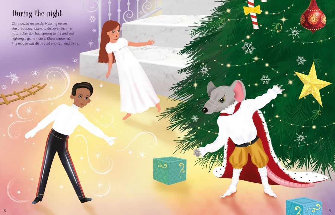 Use the stickers to dress the doll characters in this exciting version of the The Nutcracker ballet. Clara's uncle gives her a wooden nutcracker doll for Christmas, which, after a battle with the evil Mouse King, transforms into a real-life prince. Clara and the prince travel through a forest, filled with twirling snowflakes, before arriving the kingdom of the Sugar Plum Fairy, where trees are made of candy floss, cupcakes and candy canes. Clara eventually returns home. Has her experience been real or is it all an amazing dream?